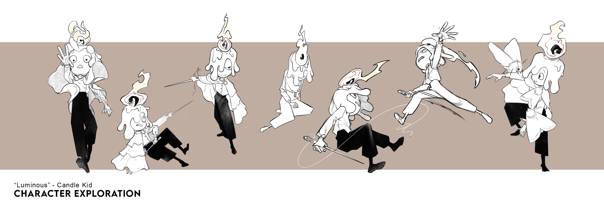 Character Design for the protagonist of the imaginary 3D platformer game, Luminous. Wherein a little lost candle must fence and rappel his way through revenging rats, festering floorboards, and unscrupulous elevator operators.